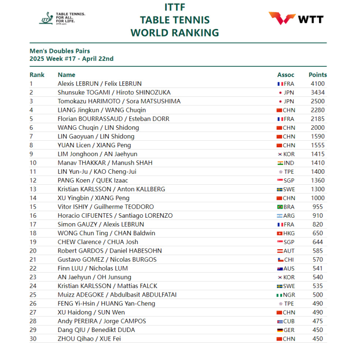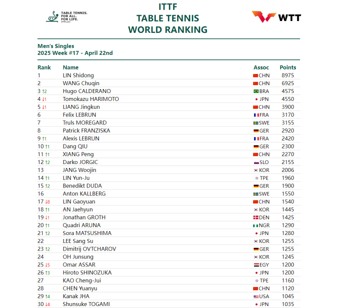 男单方面,刚刚斩获澳门世界杯男单冠军的巴西选手雨果·卡尔德拉诺,排名上升2位,来到第3;中国选手梁靖崑排名下降1位,位列第5,;林高远下降8位,位列第17。