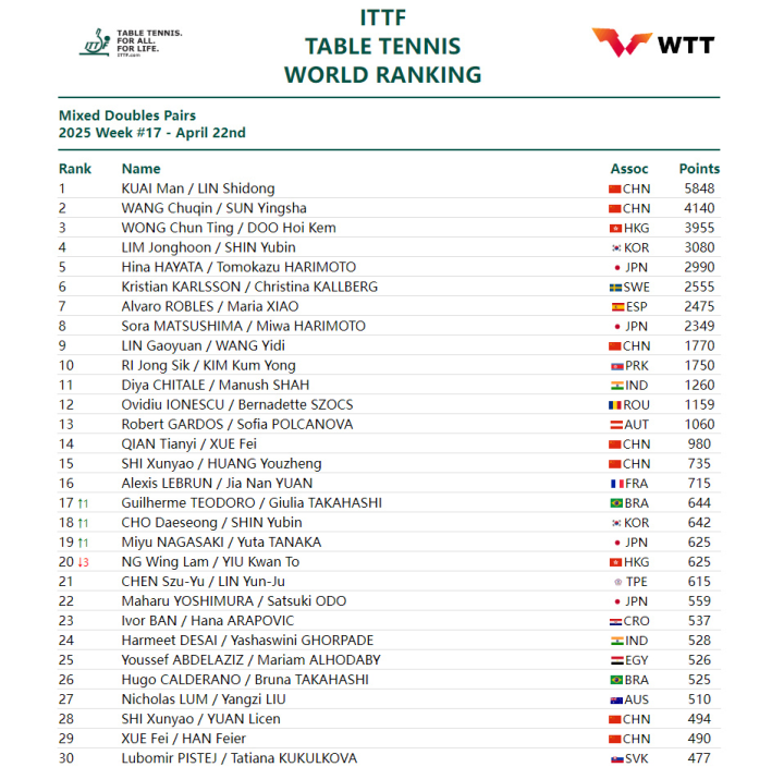 混双:林诗栋/蒯曼第1、王楚钦/孙颖莎第2、林高远/王艺迪第9