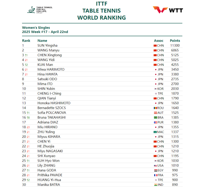 女单:孙颖莎11300世界第1,王曼昱、陈幸同、王艺迪、蒯曼位列2-5