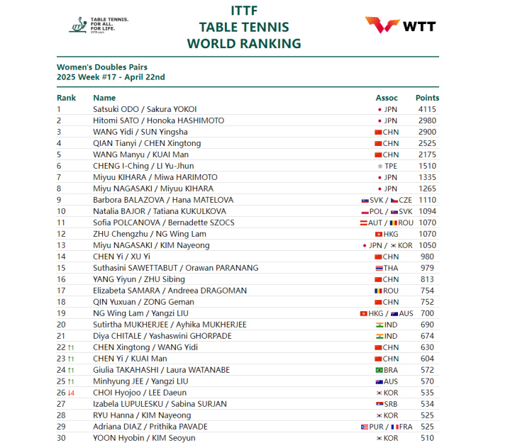 女双:孙颖莎/王艺迪第3、钱天一/陈幸同第4、王曼昱/蒯曼第5